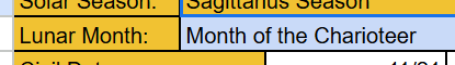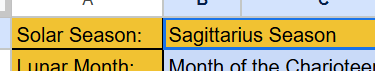 The First Bar or division of time that is listed is the “Solar Season”. For those familiar with “Western Astrology” you will notice the name to be that with the portion of the “Tropical Zodiac” that the Sun is currently in and this is where our first page of the Natural Calendar begins.